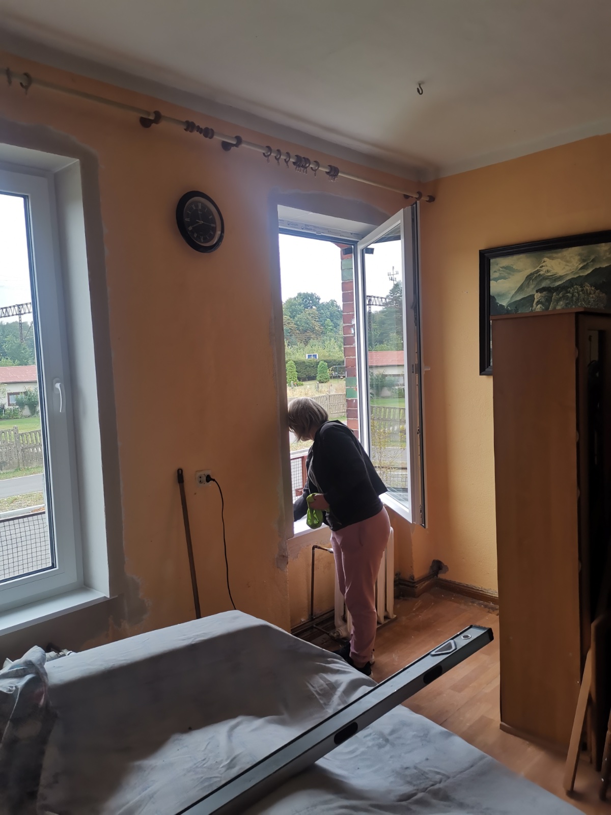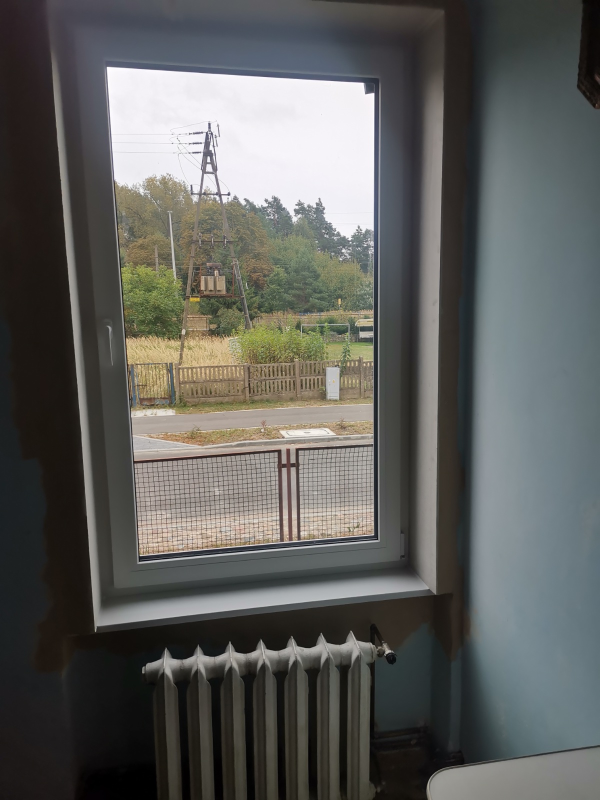 W starej poniemieckiej kamienicy wykonaliśmy demontaż okien, montaż nowych energooszczędnych okien PCV oraz obróbkę ściany wokół okna płytą GK.
